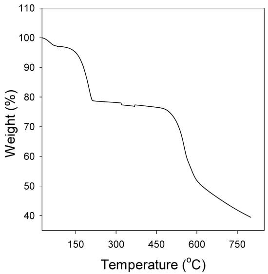The thermogravimetric analysis (TGA) of the ZIF-67@BNT nanocomposite as shown in Figure 6 reveals its thermal stability profile. The initial segment of the TGA curve, up to approximately 150 °C, shows minimal weight loss, likely due to the evaporation of surface-adsorbed moisture or other volatile components. However, a pronounced weight loss occurs between 150 and 600 °C, with the primary decomposition phase observed from around 300 °C to 500 °C. This substantial weight reduction is attributed to the degradation of the organic framework within ZIF-67 and possibly the release of structurally bound water associated with the BNT component. Beyond 600 °C, a slower rate of weight loss is noted, indicating the breakdown of more thermally resilient components within the nanocomposite, with stabilization occurring at around 800 °C [54].