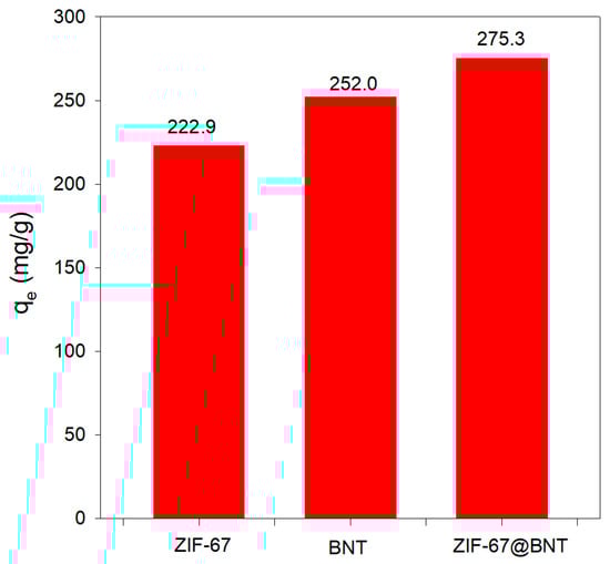 The results depicted in Figure 7 contrast the MO adsorption performance of ZIF-67@BNT nanocomposite with its parental materials (i.e., ZIF-67 and BNT). As shown in Figure 7, ZIF-67 exhibits an MO adsorption capacity of 222.9 mg/g. The ZIF-67@BNT nanocomposite, on the other hand, shows the highest MO adsorption capacity with a value of 275.3 mg/g. The enhanced performance of ZIF-67@BNT can be attributed to a synergistic effect between ZIF-67 and BNT, where the integration of BNT with ZIF-67 results in improved structural stability, increased active sites, or optimized interaction with the targeted pollutant (MO in this case). This superior capacity highlights the potential of nanocomposite materials to outperform their individual components by leveraging the strengths of their constituents. The superiority of nanocomposites generated from different materials has also been demonstrated in the literature [10,32,55,56,57,58]. Such superiority underscores the importance of material hybridization in developing advanced materials with enhanced properties, paving the way for further exploration and optimization in the wastewater treatment field.