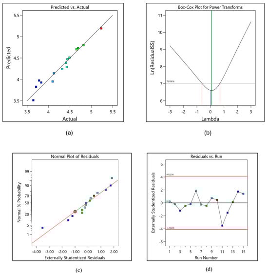 The RSM Model (for MO adsorption by ZIF-67@BNT) check plots. (a) Predicted Vs. Actual adsorption capacity, (b) Box–Cox plot, (c) Normality distribution plot, and (d) Residuals Vs. Run plot.