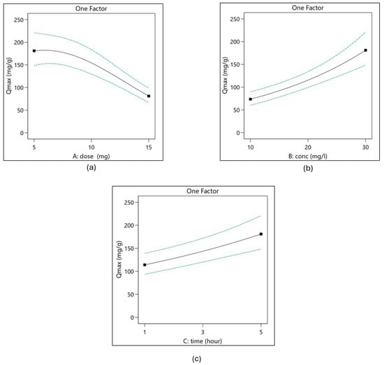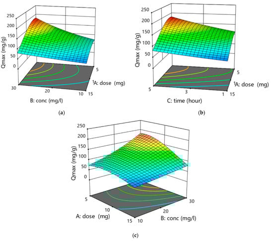 The 3D interaction plots for MO adsorption capacity: (a) MO concentration vs. ZIF-67@BNT dose, (b) Time vs. ZIF-67@BNT dose, (c) ZIF-67@BNT dose vs. MO concentration.