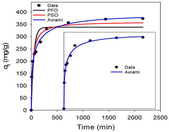 The pseudo-first order (PFO), pseudo-second order (PSO), and Avrami models were also employed for the kinetic modeling. Out of these three kinetic models, the Avrami model showed the highest R2 value of 0.9949 (Figure 12 and Table 5). This suggests that MO adsorption by ZIF-67@BNT involves a potential variation in the adsorption mechanism with the Avrami model indicating a non-linear kinetics and a better capturing of the overall MO adsorption trend as a function of time.