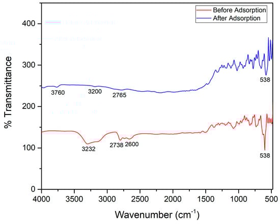 Due to the high interfacial interactions between the two adsorbent materials, ZIF-67@BNT exhibits additional distinctive peaks when compared to ZIF-67 and BNT. Electrostatic interactions between the Co2+ metal centers in the ZIF-67 framework and the negatively charged BNT surface cause structural modifications, while hydrogen bonding between the hydroxyl groups of BNT and the imidazolate linkers of ZIF-67 causes changes in vibrational frequencies. Spectral fluctuations may also be caused by the emergence of new functional groups or changes to the electrical environment of existing groups brought about by ZIF-67’s integration into the BNT matrix. Alterations to the peak intensities and movement of the peaks point to altered adsorption sites, which may improve the composite’s efficacy in pollutant removal [51,52,53].