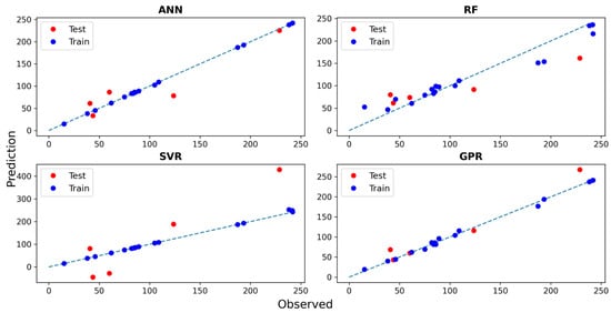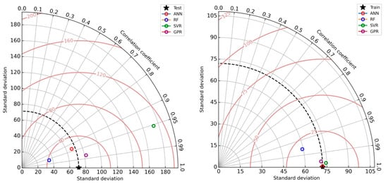 A Taylor diagram was used in this work for both training and testing datasets in order to identify the best model and assess its dependability. The standard deviation, root mean square error (RMSE), and correlation coefficient of the prediction models are all graphically depicted in the Taylor diagram (Figure 16). The GPR model (represented by the violet circle) is positioned closest to the observed data point in the Taylor diagram displayed in Figure 16, whereas the ANN model exhibits overfitting with high accuracy for the training dataset and comparatively moderate accuracy for the testing dataset. These assessment techniques provided convincing proof that the GPR model is the best option for adsorption capacity prediction, outperforming the independent MLP-based ANN, RF, and SVR models.