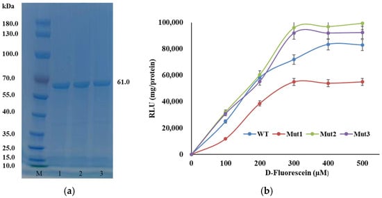 The genes encoding the WT and mutant luciferases were cloned into the pCold II vector and transformed into Escherichia coli BL21 (DE3) competent cells. Expression of the recombinant luciferase was induced with isopropyl-β-D-thiogalactopyranoside (IPTG) at 16 °C. The expressed proteins were analyzed by sodium dodecyl sulfate-polyacrylamide gel electrophoresis (SDS-PAGE) using a 15% polyacrylamide gel. The results showed that the mutant luciferases exhibited a specific band with a molecular mass of approximately 61 kDa, while no recombinant protein was detected in the control E. coli BL21 (DE3)/pCold II cells (Figure 3a).