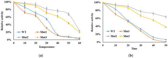 The thermal stability of the WT and mutant enzymes was evaluated as described in the Section 2. As illustrated in Figure 4a, the activities of both WT and mutant luciferases decreased with increasing temperatures. After incubation at 40 °C for 10 min, the enzymatic activities of WT and Mut1 luciferases were almost completely lost. In contrast, Mut2 and Mut3 showed significantly enhanced thermal tolerance, retaining approximately 76% and 62% of their activity, respectively. The inactivation half-lives of the WT and mutant luciferases at 50 °C were also monitored (Figure 4b). The inactivation curves revealed that Mut2 and Mut3 had the slowest inactivation rates. After 30 min at 50 °C, Mut2 and Mut3 still maintained residual activities of 64% and 38%, respectively, compared to only about 7% for WT luciferase, while Mut1 almost completely lost its activity.