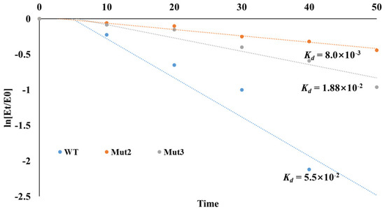 The deactivation constants (kd) for the first-order thermal deactivation were calculated using Equation (1). The kd values for Mut2 and Mut3 at 50 °C were 8.9 × 10−3 min−1 and 1.88 × 10−2 min−1, respectively, compared to 5.5 × 10−2 min−1 for the WT luciferase (Figure 5). The half-lives of Mut3 and WT luciferase were determined using Equation (2). Mut2 exhibited a half-life of 77.9 min, significantly longer than that of the WT luciferase (12.6 min). Compared to the WT, the half-lives of mutants Mut2 and Mut3 were increased by 6.18 and 2.92 times, respectively. The introduction of artificial disulfide bonds thus yielded two thermally stable mutant strains.