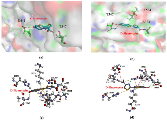 The thermal stability of Mut2 was significantly enhanced; its substrate affinity increased by 1.97 times. Generally, an increase in the number of hydrogen bonds between side chains of residues improves intermolecular interaction forces [28]. The enzyme–substrate interactions of Mut2 were investigated. As the substrate luciferin approaches the active site, the region gradually closes to encapsulate the substrate. The WT luciferase had two residues, T347 and D441, which interacted with the substrate through two hydrogen bonds (Figure 6a). For Mut2, the introduction of artificial disulfide bonds increased the intermolecular force in this region. In this study, molecular docking analysis revealed that D-fluorescein can form additional hydrogen bonds with the surrounding amino acid residues A323, T347, and K534, thereby establishing strong interactions with the substrate within the catalytic pocket region (Figure 6b). These interactions likely contribute to enhanced substrate-binding stability. Furthermore, while the WT enzyme exhibited no π–alkyl interactions (Figure 6c), Mut2 displayed π–alkyl interactions between D-fluorescein and residues D427 and R442. Additionally, a π–sulfur interaction was observed between D-fluorescein and residue H250 in Mut2 (Figure 6d). The formation of these π–alkyl and π–sulfur interactions significantly strengthened the binding affinity of D-fluorescein to Mut2, resulting in higher substrate affinity compared to the WT enzyme. The stability of a molecular docking conformation is inversely related to its binding energy; lower binding energy indicates a more stable conformation and a higher likelihood of interaction between the enzyme and substrate. In this study, the docking energies for WT, Mut2 were −19.5 kcal/mol and −23.4 kcal/mol, respectively. The more negative docking energies of Mut2 suggest stronger binding interactions with D-fluorescein compared to the WT enzyme. This finding may partly explain the decreased Km values observed for Mut2 relative to the WT enzyme, indicating enhanced substrate affinity due to the optimized interactions within the catalytic pocket.