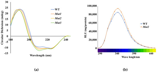 Circular dichroism (CD) spectroscopy is a powerful tool for characterizing the secondary structural changes in proteins, including enzymes. In this study, CD analysis was employed to examine the secondary structure composition of the WT enzyme and its mutants. The results revealed that the WT enzyme contained 29.95% α-helix, 19.06% β-sheet, and 43.92% random coil (Figure 7a). In contrast, Mut2 exhibited a slightly higher proportion of α-helix (31.4%) and β-sheet (19.96%), with 48.64% random coil. These findings indicate that the introduction of artificial disulfide bonds in the mutants led to an increase in the content of α-helix and β-sheet compared to the WT enzyme. This structural change suggests enhanced stability due to the additional disulfide cross-linking, which may contribute to the improved thermostability of the mutants. Similar observations have been reported in studies on 1,4-α-glucan branching enzyme (GBE), where the introduction of disulfide bonds also resulted in increased secondary structural content and stability [29].