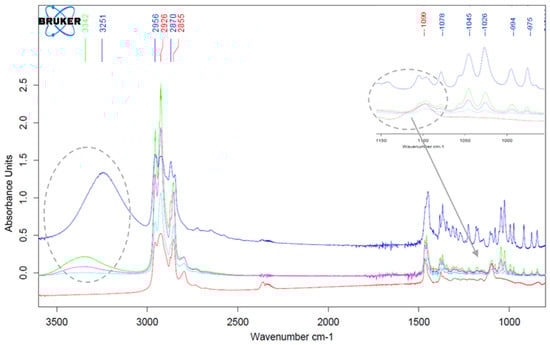 The formation of eutectic mixtures upon the direct mixing of the components in the liquid state is often attributed to intermolecular interactions leading to the formation of hydrogen bonds [39,40,41]. In order to clarify the interaction of menthol with amine upon their mixing, we conducted a series of FTIR experiments with the starting reagents—menthol and each of the amines—and then with their mixtures at different molar ratios.