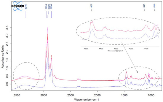 Measurements were carried out using a Bruker Vector 22 apparatus (Ettlingen, Germany) spectrometer at room temperature with a wavenumber resolution of 1 cm−1 in the frequency range of 4000–400 cm−1. The silicon substrate coated with a liquid sample was made, which was then placed in the FTIR sample holder to be analyzed directly without dilution in KBr or a solvent. In order to achieve an acceptable resolution, for each sample, 32 scans were recorded at a spectral resolution of 4 cm−1, and five replica spectra were collected to evaluate reproducibility (OPUS v.6.5.9.2.). The instrumental error of the method is of the order of ±2 cm−1 (along X axis) and 1% of the measured absorbance (along Y axis). The smallest IR shifts in the analyzed DES, commented, are of the order of 15–20 cm−1 above the accuracy of the apparatus. A background spectrum was obtained for each experimental condition to eliminate the effect of the silicon surface.