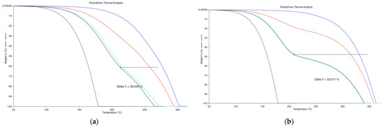 TGA decomposition profile of compounds (gray—menthol, blue—amine (DOA (a); TOA (b))), eutectic mixture (red), after extraction (green), and after re-extraction (black).