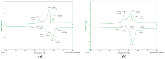 The selected DSC traces of the menthol: amine(s) (DOA and TDDA) eutectics are shown in Figure 4. The mass fraction of menthol in the mixture with DOA increases as the data are viewed from top to bottom. Menthol, DOA, and TDDA show clear endothermic peaks in the region of 35–42 °C [43,44], 11–12 °C [45], and 15–16 °C [46], respectively, as their melting temperatures. The thermograms of the various mixtures clearly indicate the formation of binary (or even triple) eutectic mixtures. Multiple thermal transition peaks are expected while heating a mixture of menthol and a suitable conformer to obtain a eutectic solvent. On the other hand, eutectic formation, irrespective of the stoichiometry, is a process accompanied by heat generation. In general, the thermal behavior of the systems studied is marked by transitions between crystalline and amorphous phases which in turn are dependent on the composition and reflect the complex molecular ordering that the systems can adopt [47]. In each of them, the melting points are significantly lower than that of menthol or amine used and hence, qualify the definition of eutectic solvent. The transitions that occur at temperatures that are significantly lower than those observed for the pure menthol and amine compounds suggest the strong interactions that exist between the components. Upon heating, the pre-melting appears sequentially as a broad convolution of several endothermic peaks between about −25 °C to 5 °C, followed up by the final melting from about 8 °C to 22 °C depending on the type of amine and its quantity in the eutectic mixture.