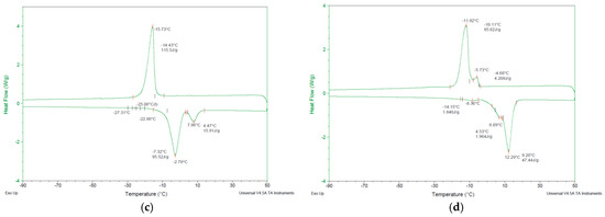 During cooling from the liquid state at 50 °C down to −90 °C, mixtures exhibit a sharp single crystallization (in the case of M/DOA 2:1) at −15.73 °C in the case of M/DOA 2:1 or more than one peak (M/DOA 1:1, 1:2 or M/TDDA 1:1, respectively) occurring at a temperature range from 8.81 °C to −20.46 °C.