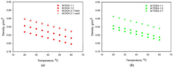 Densities of M/DOA (a) and M/TDDA (b) DES as a function of temperature.