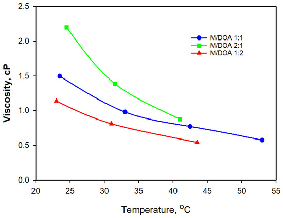 The results from the experimental viscosity measurements of M/DOA DES are presented in Figure 6. Increasing the menthol content led to an increase in the viscosity, while the increase in the DOA content led to a decrease in the viscosity.