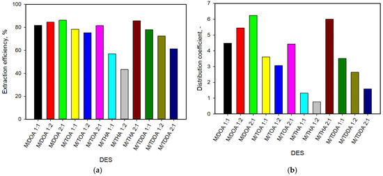Tests with all the synthesized DESs were performed to determine their ability to extract LA from an aqueous solution. A total of 15 mL of DES was mixed with aqueous LA solution (10 g/L) in a ratio of 1:1. After phase separation, the concentration in the water phase was measured, and this, in the organic phase, was calculated as a difference between the initial and final LA concentration in the aqueous phase. The values of the extraction efficiency and distribution coefficient were calculated for all 12 DESs and the results obtained are presented in Figure 7.