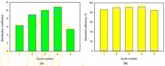 Distribution coefficient (a) and extraction efficiency (b) during consecutive extraction and stripping cycles.