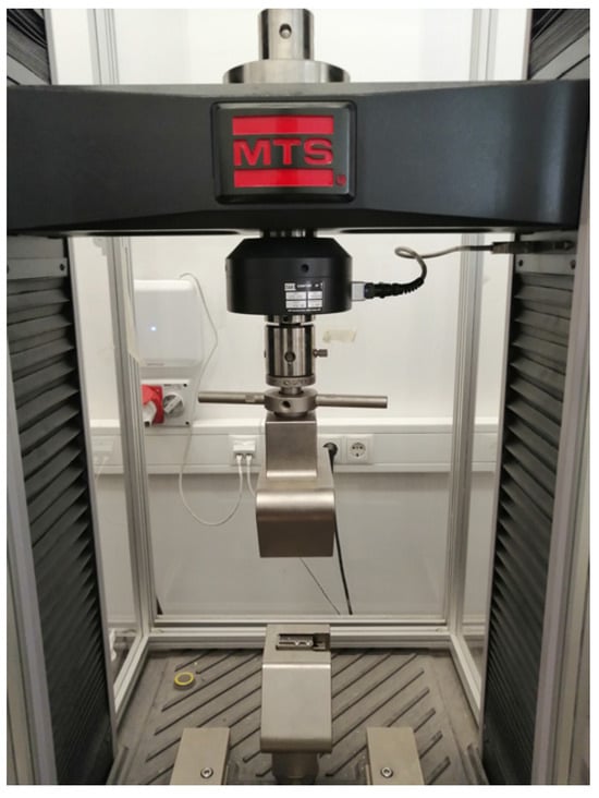 The specimens were tested in terms of tension by means of an MTS Criterion 100 universal testing machine (MTS Systems, Eden Prairie, MN, USA) equipped with a 100 kN load cell available at the Materials Characterization Lab of the Free University of Bolzano (see Figure 2). For each tensile test, the applied force and the crosshead displacement were acquired. The deformation rate was set to 1 mm/min in order to achieve quasi-static conditions at room temperature.