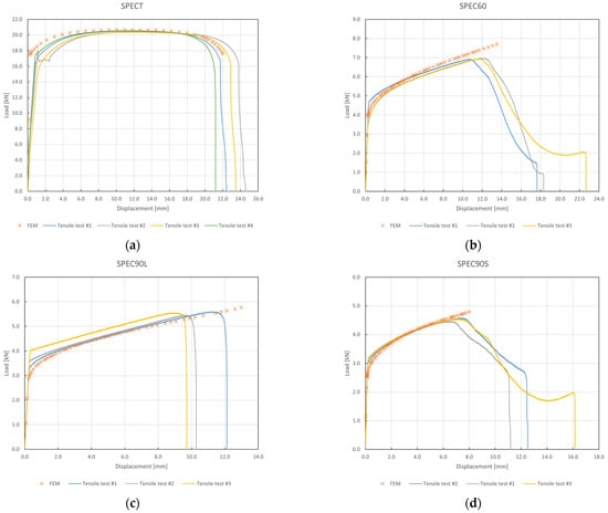 Comparison between force–displacement points obtained through FEM analysis and tensile tests of specimens: (a) SPECT (tensile test #2 was discontinued due to slipping of the specimen during testing), (b) SPEC60, (c) SPEC90L, and (d) SPEC90S.