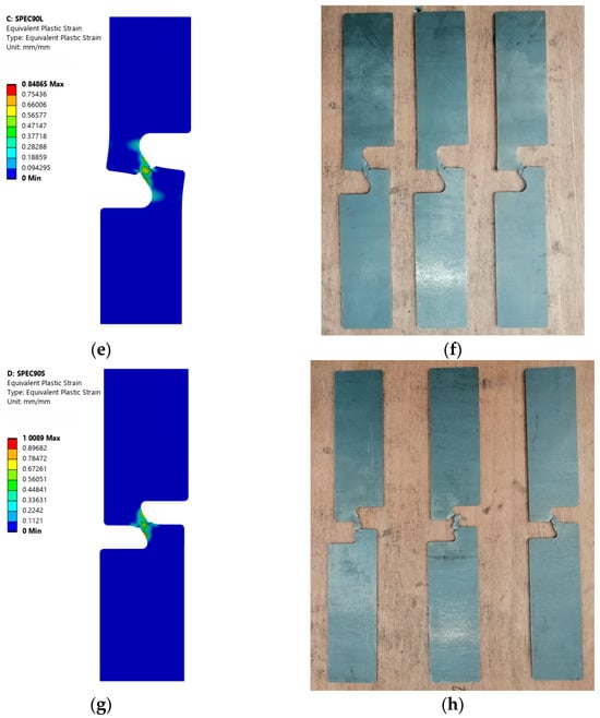 Comparison between the specimens’ deformed shapes as predicted by the FEM model and the experimental results obtained through tensile testing: (a) equivalent plastic strain for SPECT and (b) broken SPECT specimens, (c) equivalent plastic strain for SPEC60 and (d) broken SPEC60 specimens, (e) equivalent plastic strain for SPEC90L and (f) broken SPEC90L specimens, and (g) equivalent plastic strain for SPEC90S and (h) broken SPEC90S specimens.