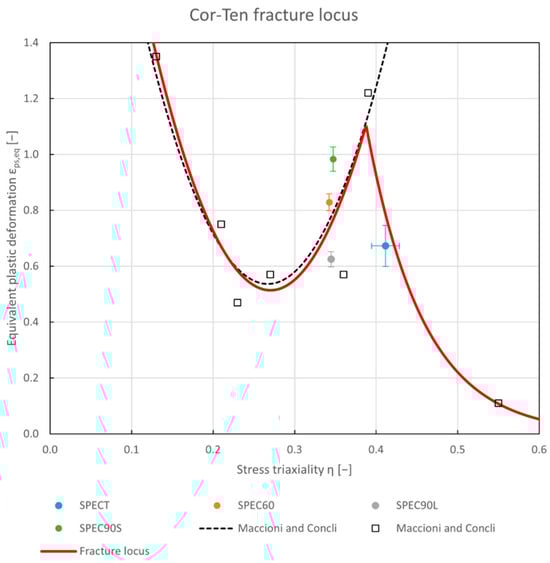The experimental points obtained from the tensile testing of the four specimens were integrated with the data obtained by Maccioni and Concli for Cor-Ten steel []. As shown in Figure 6, the experimental points obtained in the present study correlate well with the parabolic trend proposed by Maccioni and Concli. Particularly, the experimental points belonging to the fracture onsets for SPEC60, SPEC90L, and SPEC90S suggest a strong gradient of the fracture locus approaching the 0.4 value of triaxiality, where the transition between fracture mechanisms [] would be expected, and thus the fracture locus shows a local maximum. By including the point related to the SPECT specimen, the fracture locus can be determined in the high stress triaxiality range by means of an exponentially decreasing function [,,].