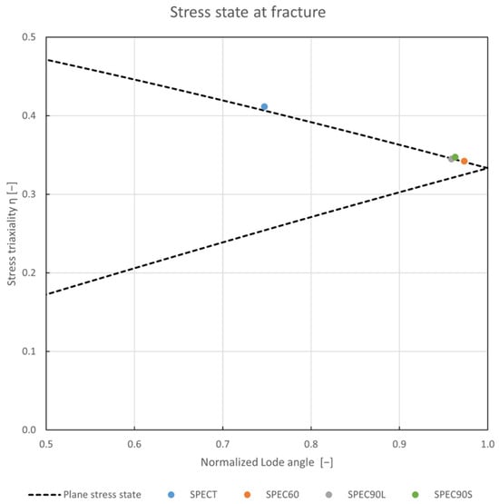 Stress states upon fracturing for the four specimens represented in the triaxiality-normalized lode angle plane .