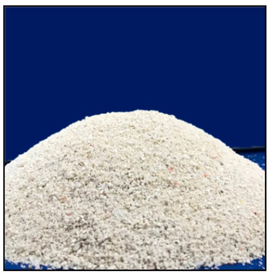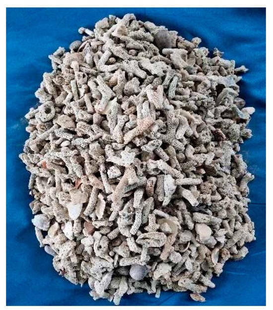 This study utilized coral fragments from the Philippines as coarse aggregates (Figure 1) and fine aggregates (Figure 2 and Figure 3). The original coral coarse aggregate (CCA) contained a significant number of coral particles with diameters exceeding 20 mm. In this study, a jaw crusher was used for secondary crushing to prevent an excessive proportion of large-sized coral aggregates from affecting the development of concrete strength. The particle size of the crushed CCA ranged from 2.36 mm to 19 mm, as shown in Figure 4, which was determined based on the sieve analysis and material properties according to the standard JGJ51-2002 []. Table 1 presents the physical properties of the CCA.