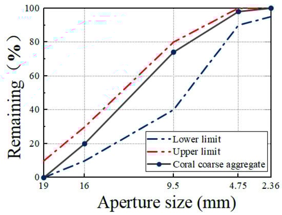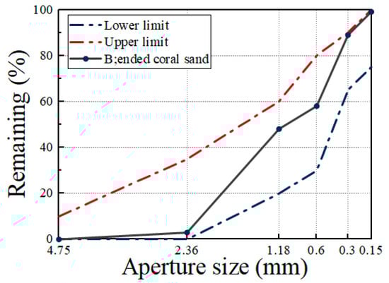 In this study, coral coarse sand and coral fine sand were mixed in a 1:1 mass ratio to obtain mixed coral sand, which helps avoid the issue of a single type of coral sand leading to poor gradation, which can be detrimental to the development of concrete strength. The particle size distribution of the mixed coral sand was analyzed, and its material properties were measured in accordance with standards GB/T17431-2010 [] and JGJ52-2006 []. The relevant parameters are presented in Figure 5 and Table 2. The blended coral sand was classified as a lightweight aggregate, with a fineness modulus of 3.0, falling into the medium sand zone II, and had a continuous grading.