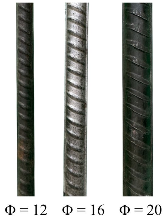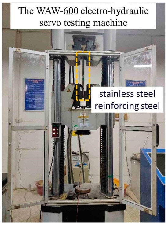 Figure 6 shows the 304 SSR used in this study. According to the standard GB/T228.1-2021 [], a WAW-600 electro-hydraulic servo testing machine (Yanrun Light Machine Technology Co., Ltd. in Shanghai, China)was employed to conduct tensile tests on SSRs of various diameters at room temperature (Figure 7). Table 6 shows the fundamental mechanical properties of the SSRs. Unlike an ordinary carbon steel rebar, the SSR did not exhibit a yield plateau; therefore, its nominal yield strength was defined as the stress corresponding to a 0.2% plastic strain. The nominal yield strength of the SSR was 515.0 MPa, with a tensile strength of 804.1 MPa, an average elastic modulus of 167.1 GPa, and an elongation after fracture of 40.0%, indicating it was a ductile rebar material.