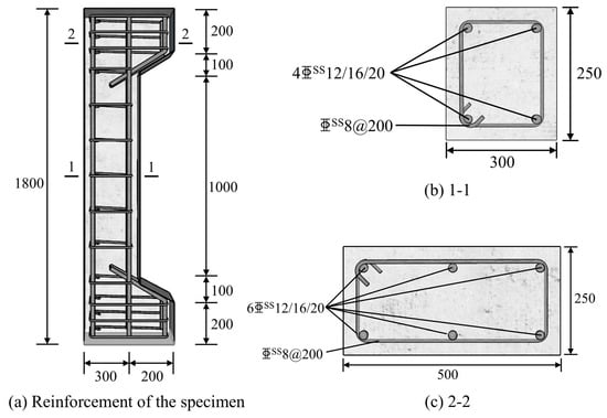 Table 7 shows the detailed parameters of each specimen, where b is the width, h is the height, and l is the length of the cross-section of the SCGCs, in mm; d is the diameter of the longitudinal bars, in mm. Figure 8 shows the schematic diagram of the distribution of reinforcement bars in the specimens, where “DSS” represents the 304 SSR used in this test. The longitudinal and transverse reinforcement of the eight SCGC specimens used 304 SSRs, labeled as SCGC1 to SCGC8, according to different values of ρs and e0. The specimens had a rectangular cross-section with dimensions of 250 mm × 300 mm and a symmetrical reinforcement arrangement. The central section included four longitudinal SSRs of the same diameter, with the longitudinal reinforcement ratios set at 0.302%, 0.536%, and 0.838%, and eccentricities set at 70 mm, 140 mm, 210 mm, and 280 mm. The stirrup diameter spacing was set at 200 mm, with a cover thickness of 30 mm, to closely match practical engineering conditions. Loading and end damage prevention were prioritized during testing. The ends of the SCGC specimens were equipped with enlarged loading flanges and densified stirrups in the flange area. The stirrup spacing was set at 100 mm. Additionally, two SSRs of the same diameter were added to increase the reinforcement ratio.