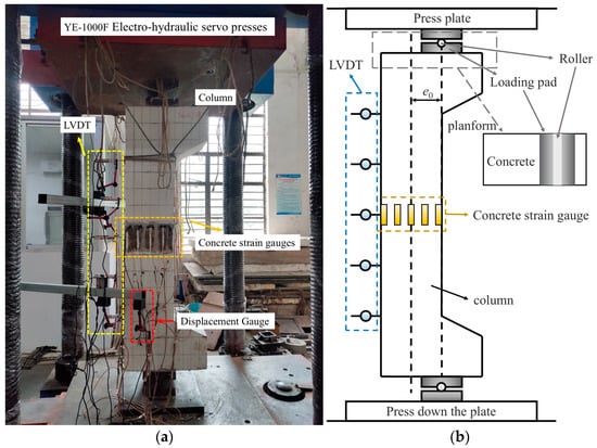 The tests were conducted using a YE-1000F electro-hydraulic servo press (Bonwei Electromechanical Control Engineering Co., Ltd. in Hangzhou, China) with a maximum load capacity of 10,000 kN (Figure 9a). To simulate the realistic stress state of eccentrically compressed members, a hinged support structure composed of rollers and loading plates was installed at both ends of the specimen. Both rollers and loading plates were fabricated from Q235 steel, with their long sides matching the width of the specimen’s cross-section (Figure 9b). Pre-marked load application points on the top and bottom surfaces of the specimen enabled the adjustment of the hinged support positions, thereby facilitating the application of various eccentric loads. Strain and displacement data at each loading stage were recorded using a DH3821 static strain measurement system (Donghua Test Technology Co., Ltd. Jingjiang, China).