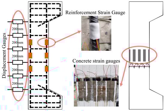 Figure 10 shows the placement of lateral displacement meters, strain gauges on longitudinal reinforcement, and strain gauges on concrete. Displacement meters were evenly arranged along the height of the column to capture lateral displacements at different stages. Additionally, a single displacement meter was placed on the side to monitor whether the specimen was subjected to unidirectional eccentric compression during loading. A crack width detector was used to observe and measure crack widths, while a ruler was used to measure crack spacing. Concrete strain gauges were evenly attached at the mid-height of the column to measure longitudinal strain at various stages. Strain gauges were also attached at the mid-section of the longitudinal reinforcement and 200 mm above and below this point to measure the strain behavior of the SSR at each stage.