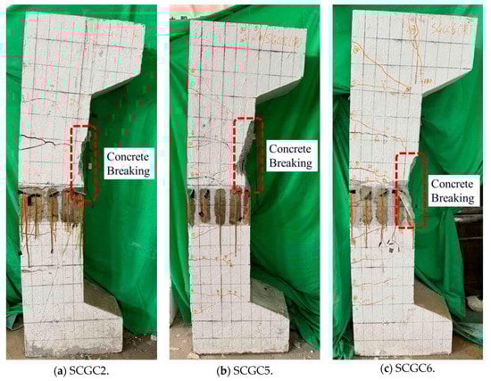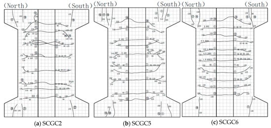 Figure 11 shows the failure patterns of the selected SCGC specimens (taking SCGC2, SCGC5, and SCGC6 for examples). Figure 12 shows the crack propagation in the SCGCs (taking SCGC2, SCGC5, and SCGC6 for examples). While the failure pattern of SCGCs under combined compression and bending is similar to the eccentric compression patterns observed in ORC columns by Li [], the SCGCs exhibit greater lateral deformation.