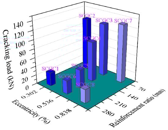 Figure 13 and Figure 14 present the experimental results of the cracking load (Ncr) and ultimate load (Nu) of the SCGC. As the eccentricity increased, both Ncr and Nu of the SCGC decreased; with the increase in the reinforcement ratio, Nu increased, but Ncr showed no significant change. For the SCGC with the same ρs, when e0 was increased to 2, 3, and 4 times its initial value of 70 mm, Ncr decreased by 25%, 67%, and 75%, respectively, while Nu decreased by 40%, 71%, and 80%. For the SCGC with the same e0, when ρs was increased by 1.77 times and 2.77 times from the initial 0.302%, Nu increased by 12.6% and 27.2%, respectively. However, before the SCGC cracked, the strain in the SSR was minimal, resulting in negligible tensile stress. Therefore, the tensile resistance of the SCGC was primarily provided by the concrete, making the influence of ρs on Ncr insignificant.
