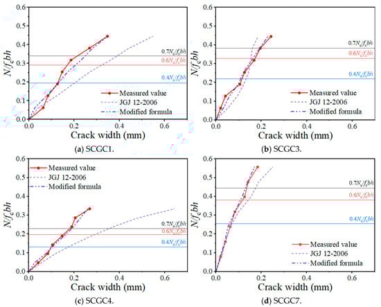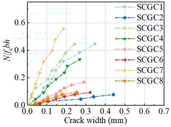 Figure 15 shows the relationship between N/fcbh and the crack width. It can be observed that an increase in e0 or a decrease in ρs accelerates the rate of crack width development, and the crack width development for each SCGC shows an approximately linear trend.