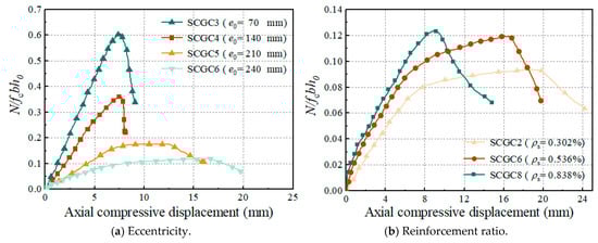 In summary, the SCGC specimens tested in this study do not exhibit full-section compression. SCGC8 experienced premature failure due to the slippage of the reinforcement in the anchorage region, resulting in significantly lower load-carrying capacity and thus is excluded from the load-carrying capacity analysis. When e0 = 70 mm and 140 mm, the specimens exhibit small eccentric compression failure; when e0 = 210 mm and 280 mm, the specimens experience large eccentric compression failure.