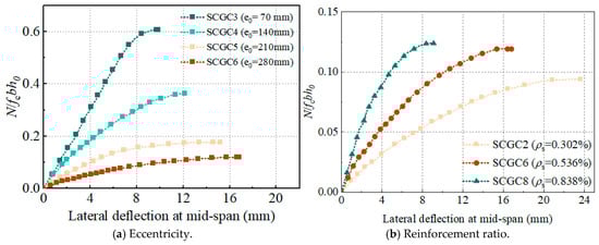Figure 17 illustrate the effects of e0 and ρs on the load–midspan lateral displacement curves. The overall trends of these curves are consistent. Cracks on the tension side of the column appear earlier in the early stage of loading, as e0 increases (or ρs decreases). This leads to a significant reduction in the lateral stiffness. Consequently, there is a marked increase in the midspan lateral deflection. The lateral displacement curves of the column become steeper as e0 increases (or ρs decreases) during the mid-to-late stages of loading.