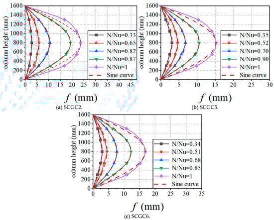 Figure 18 presents the lateral displacement curves of SCGC2, SCGC5, and SCGC6 under various loading stages. It can be observed from Figure 18 that the lateral displacement curves exhibit a half-sine wave distribution form from the initial loading of the SCGC until the failure stage. The shape conforms to the function of a standard sine curve, expressed as f1 = fsin(πx/l), where f1 is the lateral deflection, in mm; f is the maximum midspan lateral deflection under each load stage, in mm; and l is the height of the column, in mm.