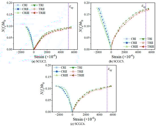 Figure 19 shows the N/fcbh—SSR strain relationship curves (taking SCGC2, SCGC5, and SCGC6 for examples). In these curves, “CR” represents the compressive SSR, “TR” represents the tensile SSR, and εsy represents the tensile yield strain of the SSR. It can be observed that under large eccentricity (e0/h ≥ 0.7), the SSR on the side farther from the axial force reaches its tensile yield strength, indicating full utilization. Additionally, the tensile and compressive curves of the SSR show different rising trends, exhibiting distinct tension–compression behavior, which is consistent with the findings of Yuan [].