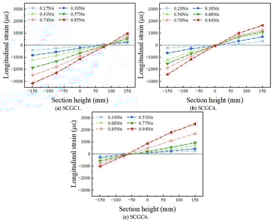 Figure 20 shows the concrete strain distribution at the midspan section during various loading stages (taking SCGC1, SCGC4, and SCGC6 for examples). Here, εsc represents the SSR strain on the side closer to the axial force and εst represents the SSR strain on the side farther from the axial force. The average strain across the transverse section of the SCGC is almost linearly distributed. As the external load increases, the neutral axis gradually shifts toward the edge of the compressive zone of the SCGC. During loading, the concrete strain of the midspan section varies roughly linearly along the height of the section, consistent with the assumption of a planar section.
