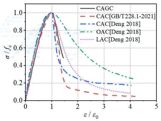 It can be observed that in the ascending segment, the curves for CAC, ordinary aggregate concrete (OAC), and lightweight aggregate concrete (LAC) are almost identical to the CAGC curve. However, in the descending segment, the CAGC curve is steeper than the OAC and LAC, but flatter than the CAC. Overall, the constitutive relationship curve of CAGC significantly differs from that of CAC, OAC, and LAC, indicating that their stress–strain relationships are not applicable to CAGC.