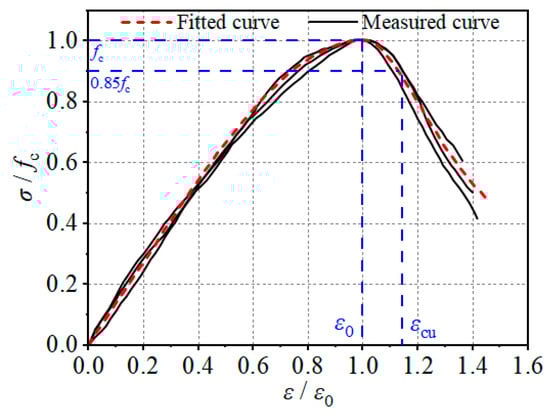 Therefore, this paper proposes an optimized uniaxial constitutive model for CAC, based on the work of Liu [] and Da [], as shown in Equation (1). A fitting analysis was conducted, and the results are presented in Figure 22.