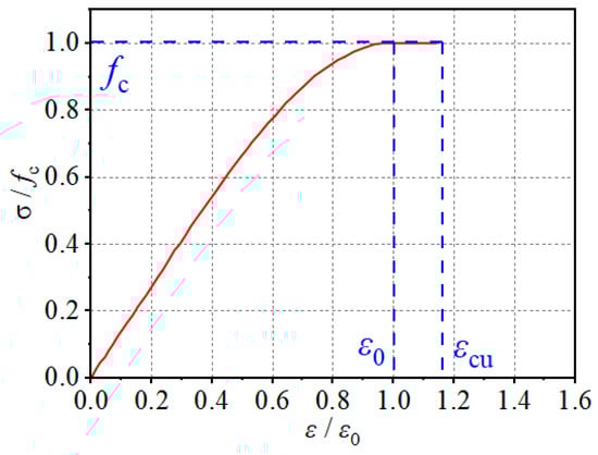 where σ is the stress of CAGC, in MPa; fc is the axial compressive strength of CAGC, with a measured value of fc = 29.0 MPa in this study; ε is the strain of CAGC; ε0 is the compressive strain of CAGC when the compressive stress reaches fc, with ε0 = 0.0024; εcu is the ultimate compressive strain of CAGC, taken as εcu = 0.0028; and a and b are the control parameters for the ascending and descending segments of the curve, with values of a = 1.31 and b = 7.892, respectively.