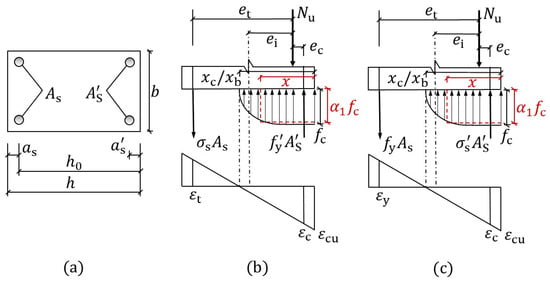 where is the design value of the compressive strength of the SSR, in MPa. When e0 is large, the SCGC section will experience large eccentric compression, as shown in Figure 24b. The steel reinforcements that are farther from the axial force reach the yield state, and the concrete in the compression zone reaches its compressive strength. However, it is verified that the steel reinforcement that is closer to the axial force has not reached its yield state based on the strain measurements of the SSR. Therefore, based on the plane section assumption and force equilibrium, the following formula can be derived: