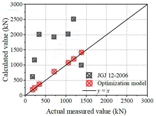 On the other hand, as discussed in Section 3.3, only the SSR that is farther from the axial force reaches the yield point under the large eccentricity failure pattern of the SCGC. This differs from the assumption in the JGJ12-2006 [] code, which states that both the tensile and compressive reinforcements yield. However, the mechanical behavior of the SSR is similar to that described in the JGJ12-2006 [] code under the small eccentricity failure pattern of the SCGC.