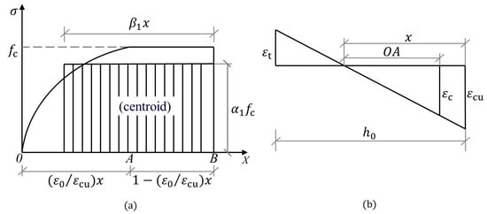 In the equivalent stress diagram (Figure 27), x represents the equivalent length (shaded area in Figure 27). And OA corresponds to the parabolic portion of the theoretical stress block, while AB represents the rectangular portion of the theoretical stress block: