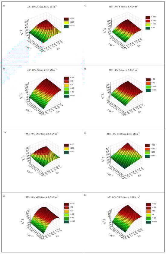 Entering stiffness k as a variable was essential to research on modelling soil–tool interactions. As shown earlier, tool stiffness can significantly affect draught forces, which is confirmed in the literature [40]. Stiffness affects the susceptibility of the tool to adapt to soil conditions, especially when the soil is more compact or when there is significant working resistance resulting from the operation of the tools at specific technical parameters. Including this parameter in the mathematical model enabled a more accurate prediction of the values of the forces acting on the tool.