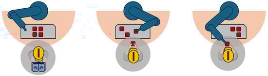 In recent years, collaborative robots have gained significant popularity, primarily due to their ability to work alongside human operators without the need for safety enclosures. Human–Robot Collaboration (HRC) can be classified into three distinct levels: coexistence, cooperation, and collaboration [19], as illustrated in Figure 1. These levels are directly related to the nature of interaction between the human worker and the robot within their respective workspaces.