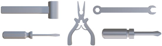 Since a preexisting dataset of hand tools that met specific requirements could not be found, a custom dataset was created using the myGym tool [51]. The Generate Dataset tool within myGym allows for the creation of a synthetic dataset tailored for the custom training of vision models. A range of commonly used hand tools was selected, including combination pliers, a hammer, a flat screwdriver, a Phillips screwdriver, and various sizes of open-end wrenches (Figure 3). Each type of tool presents unique characteristics, shapes, purposes, and quantities, which increases the complexity of the robotic tool-feeding application. During the creation of the dataset, several key factors were varied, including the textures and colors of the objects, lighting conditions, and tool models. The dataset was generated multiple times with different color schemes for the tools and varying the number of images, significantly increasing the diversity and variability of the training data. This approach allowed for the simulation of a wide range of real-world visual scenarios, improving the model’s robustness and ability to recognize tools under diverse conditions. The variability in lighting and tool appearance was specifically aimed at enhancing the model’s performance in environments with fluctuating lighting, varying tool positions, and different background settings. Although the synthetic dataset provides a controlled environment for training, further testing in real-world conditions is necessary to fully assess the model’s applicability and robustness.