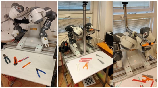 In the design of the robotic workplace, two distinct computer vision models with varying training parameters were employed. Both models yielded suboptimal results, each exhibiting specific advantages and limitations. YOLOv8 demonstrated superior tool detection and greater robustness to varying tool rotation angles but was characterized by inaccurate segmentation of the detected tools. In contrast, YOLACT provided more precise segmentation of the tools but exhibited poor performance with respect to tool rotation angles. The issues encountered in calculating the take-off position of the tool and evaluating its rotation were likely due to an inadequate dataset size and suboptimal selection of the computer vision model. To provide a more comprehensive evaluation of the proposed approach, additional experimental results are presented in Appendix A and Appendix B.